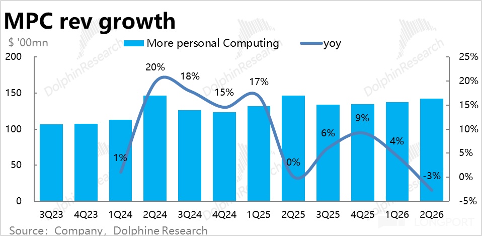 4、個人業務比較疲軟:本季傳統的個人業務增長比較弱,營收增速再度轉負,爲-3% yoy。具體來看,主要是硬件銷售較差,包括 Windows 業務線內的 PC 設備,和遊戲業務線內的主機硬件。而此季度內,內存漲價的影響應該還未充分傳導,可見電子產品的需求是較弱的。