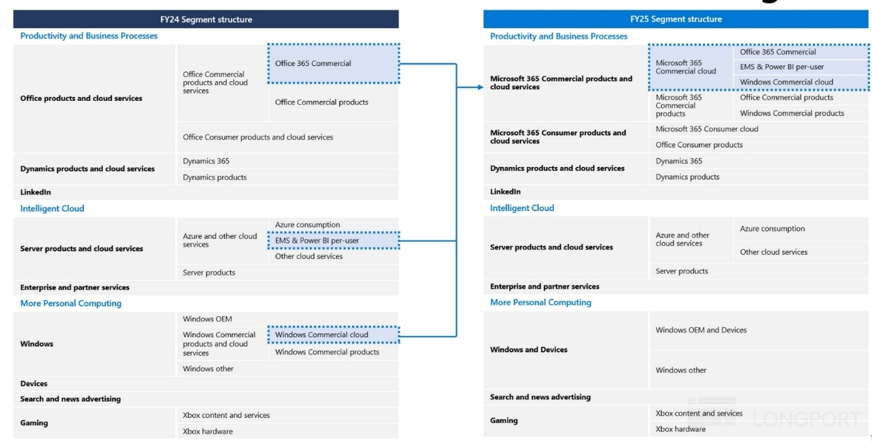 25 財年開始微軟對財報披露的部門結構做出不小的調整。整體的調整思路是把面向企業的各類 365 服務,包括 Commercial Office 365, Windows 365 和 Security 365,全部從各自原板塊調整到生產力&流程(PBP)大板塊下。具體的調整變化,和海豚君的看法請見1Q25 點評。下圖是簡要概括,此處就不再贅述了。