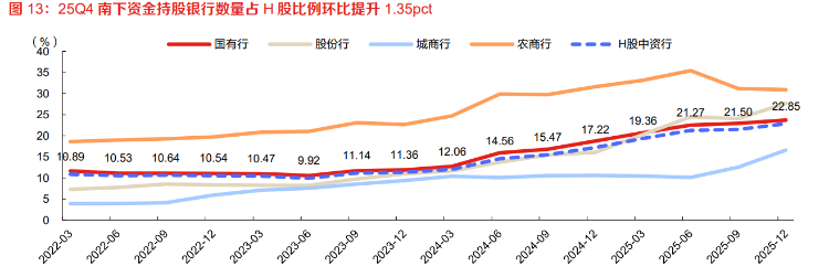 驅動因素方面,瑞銀、高盛等機構均指出南向資金的配置需求日益成爲港股高股息的重要支撐力量。據統計,2025年南向資金淨流入達到1.4萬億港元,2026年預計仍將保持淨流入。對此,東方證券在研報中指出,南向資金在配置方向上更青睞中資銀行,截至25Q4,南向資金持股H股中資行共計約1329億股,環比增加49.77億股,佔H股股本比例環比提升1.35pct至22.85%;個股層面,四大行持股數均有明顯增加,青島、招行持股比例大幅上升。