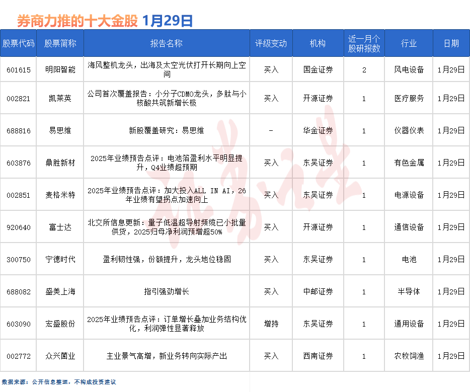 明陽智能最受券商關注,近一個月獲東吳證券等2份券商研報關注,位居1月29日券商力推股榜首。