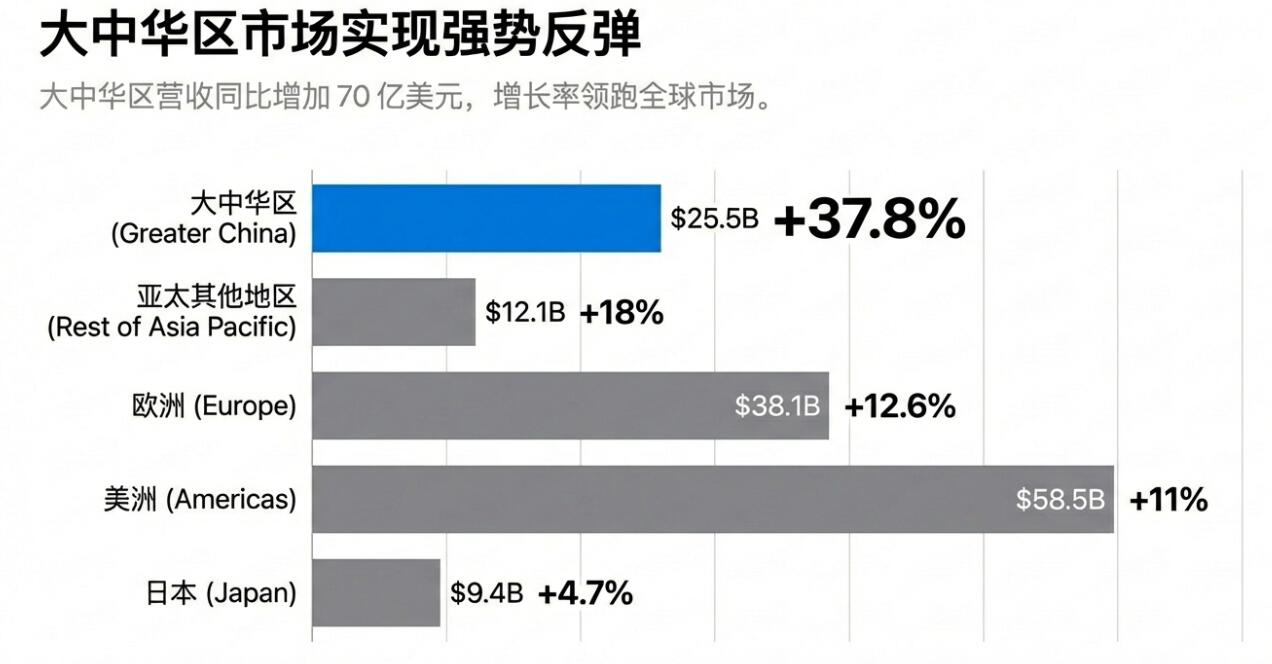分區域市場看,四季度大中華區成爲亮點,成爲當季蘋果收入增長的重要貢獻市場。