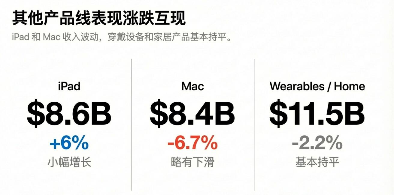 而Mac和可穿戴設備均表現遜色。四季度Mac收入近83.9億美元,同比下降近6.7%,較分析師預期91.3億美元低逾8%,分析師預計同比增約1.6%。