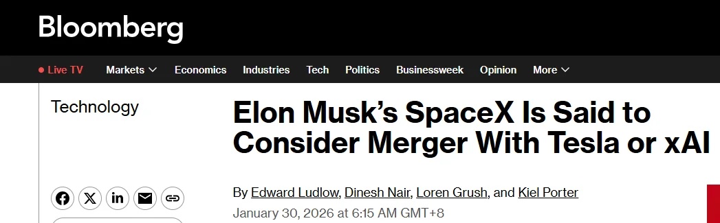 據報道,知情人士稱,SpaceX正在考慮與特斯拉潛在合併,同時也在評估與人工智能公司xAI的整合方案。知情人士透露,該公司已探討過SpaceX與特斯拉合併的可行性,一些投資者正在推動這一想法。另有部分知情人士稱,他們還在探索在首次公開募股(IPO)之前SpaceX與xAI合併的可能性。知情人士透露,任何交易都可能吸引基礎設施基金和中東主權投資者的濃厚興趣。其中一位知情人士還表示,相關交易也可能需要配套的大規模融資。