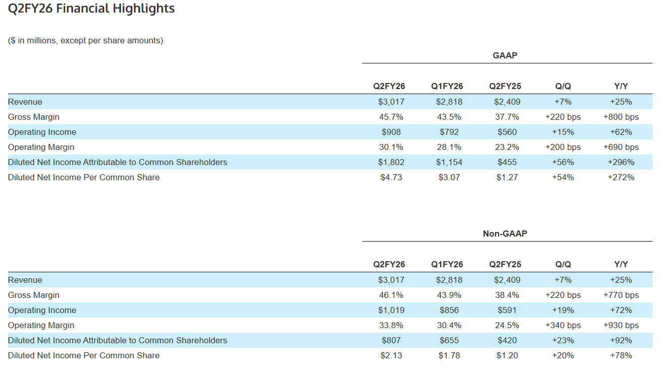 財報顯示,公司二季度營收達30.2億美元,同比增長25%;非GAAP口徑下每股收益2.13美元,同比大增78%。毛利率繼續走高,GAAP毛利率爲45.7%,非GAAP毛利率爲46.1%。現金流表現同樣強勁,經營活動現金流7.45億美元,自由現金流6.53億美元。