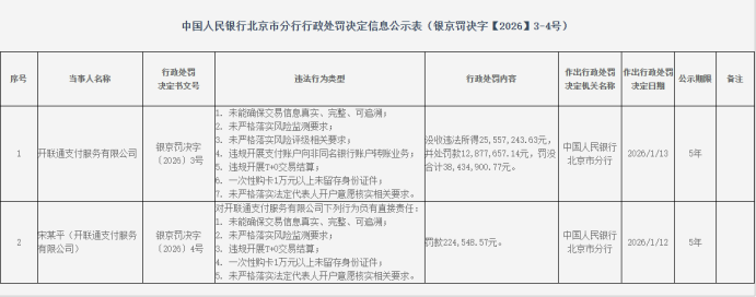 1月21日,央行北京市分行公佈的行政處罰決定信息公示表顯示,開聯通支付服務有限公司因7項違法違規行爲被沒收違法所得2555.72萬元,並處罰款1287.77萬元,罰沒合計3843.49萬元。