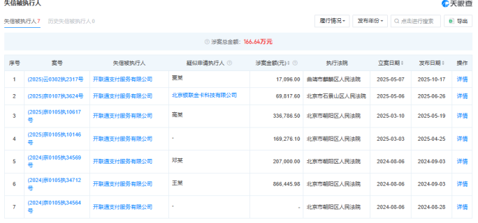 欠稅之外,開聯通支付還深陷法律糾紛與信用危機。中國執行信息公開網顯示,該公司目前可查詢的被執行信息已達21條,僅2025年就新增近20起,執行標的從數萬元到20多萬元不等,且已有7起案件被列入失信被執行人名單。