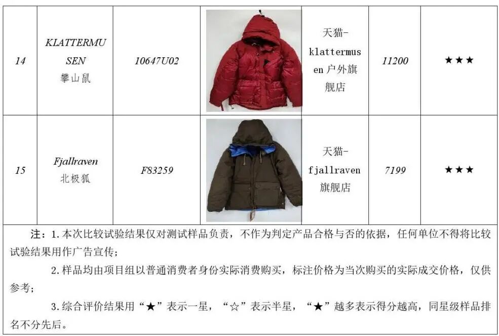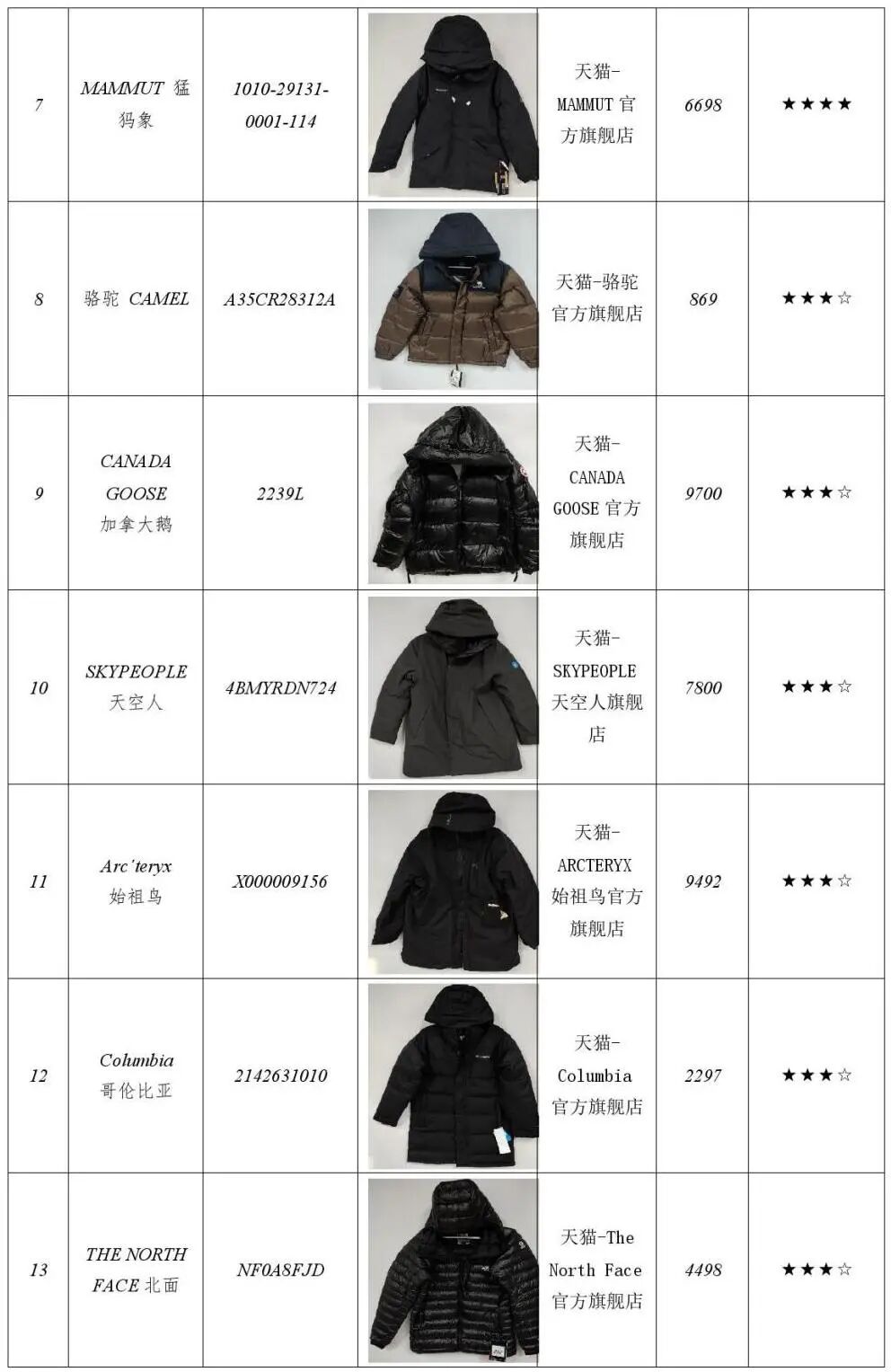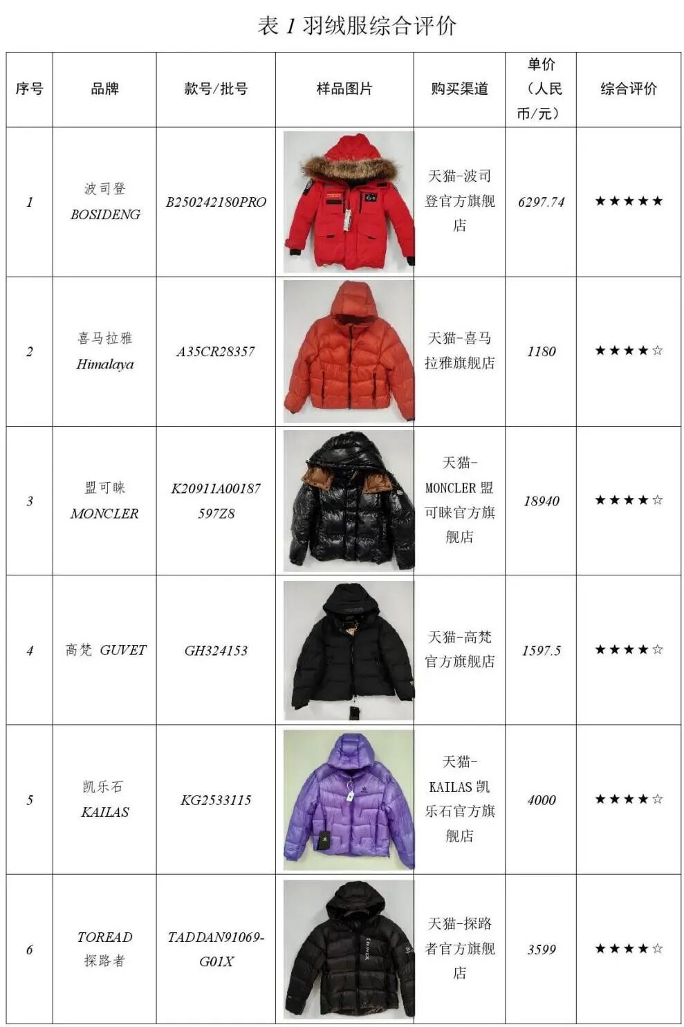 綜合各項指標,波司登BOSIDENG(款號/批號:B250242180PRO)獲得五星綜合評價,喜馬拉雅Himalaya(款號/批號:A35CR28357)、盟可睞 MONCLER(款號/批號:K20911A00187 597Z8)、高梵 GUVET(款號/批號:GH324153)、凱樂石KAILAS(款號/批號:KG2533115)、TOREAD 探路者(款號/批號:TADDAN91069-G01X)5款產品獲得四星半綜合評價。