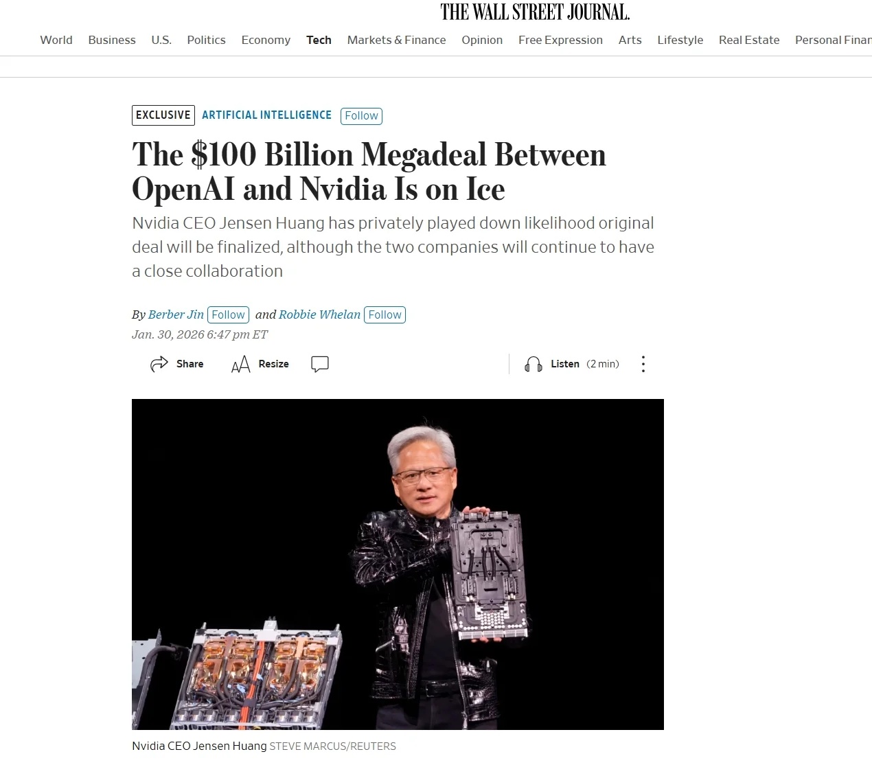 1月31日,據華爾街日報報道,英偉達原本計劃向 OpenAI 投資至多 1000 億美元,助力其訓練和運行最新人工智能模型,但因這家芯片巨頭內部部分人士對該交易提出質疑,相關計劃已陷入停滯。