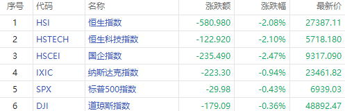 港股方面,恒生指數週漲2.38%,報27387.11點;恒生科技指數週跌1.38%,報5718.18點;國企指數週漲1.71%,報9317.09點。