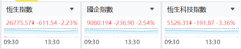 港股週一顯著承壓,三大指數全線下跌。恒生指數收報26775.57點,跌2.23%;國企指數收報9080.19點,跌2.54%;恒生科技指數受壓更重,收報5526.31點,跌3.36%。