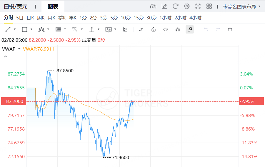 現貨白銀跌幅從最多16%收窄至2.95%,報82.20美元/盎司。