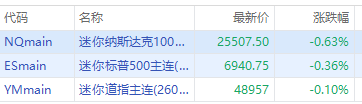 美股三大期指週一集體走低,納指期貨 $NQmain 跌0.63%,標普500期貨 $ESmain 跌0.36%,道指期貨 $YMmain 跌0.1%。