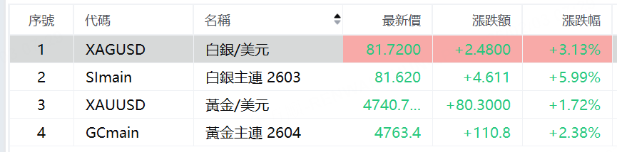 現貨金銀週二盤初走強,現貨黃金漲至4740美元/盎司,日內漲1.7%;現貨白銀漲超3%,報81.72美元/盎司。