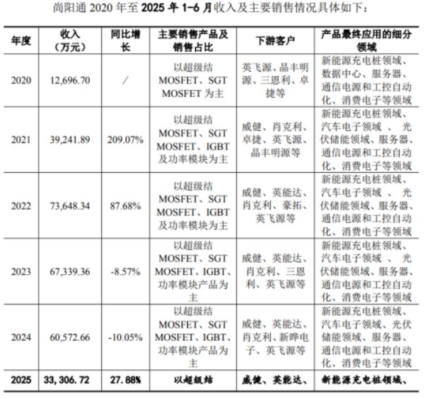 此外,與士蘭微、斯達半導等規模較大的同行業國內廠商相比,尚陽通的產品佈局及下游領域相對集中,因此在行業下行週期中受到的需求衝擊更爲直接和劇烈,其2023年至2024年的營收降幅也較前述兩家公司更大。