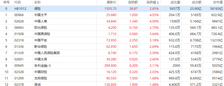 華盛資訊2月3日訊,港股保險股盤中強勢,中國太平、中國人壽漲4%,陽光保險、中國再保險、中國平安漲超3%,新華保險、中國人民保險集團、中國太保漲超2%,友邦保險、保誠漲超1%。