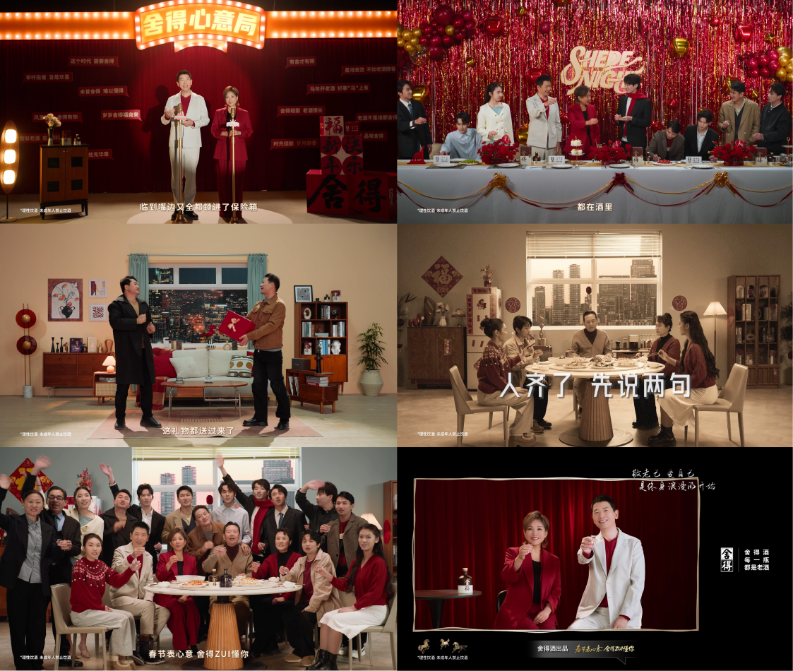 通過此次春節大片,捨得酒完成了一場有溫度的情感溝通。圍繞“心意”內核,捨得酒覆蓋春節情感表達全維度場景,達成從“產品功能”到“情緒價值”的躍遷。同時,藉助明星話題度與國民認知度,捨得酒進一步增強消費者的信賴感和親切感,提升品牌在春節場景中的心智佔領與情感滲透。