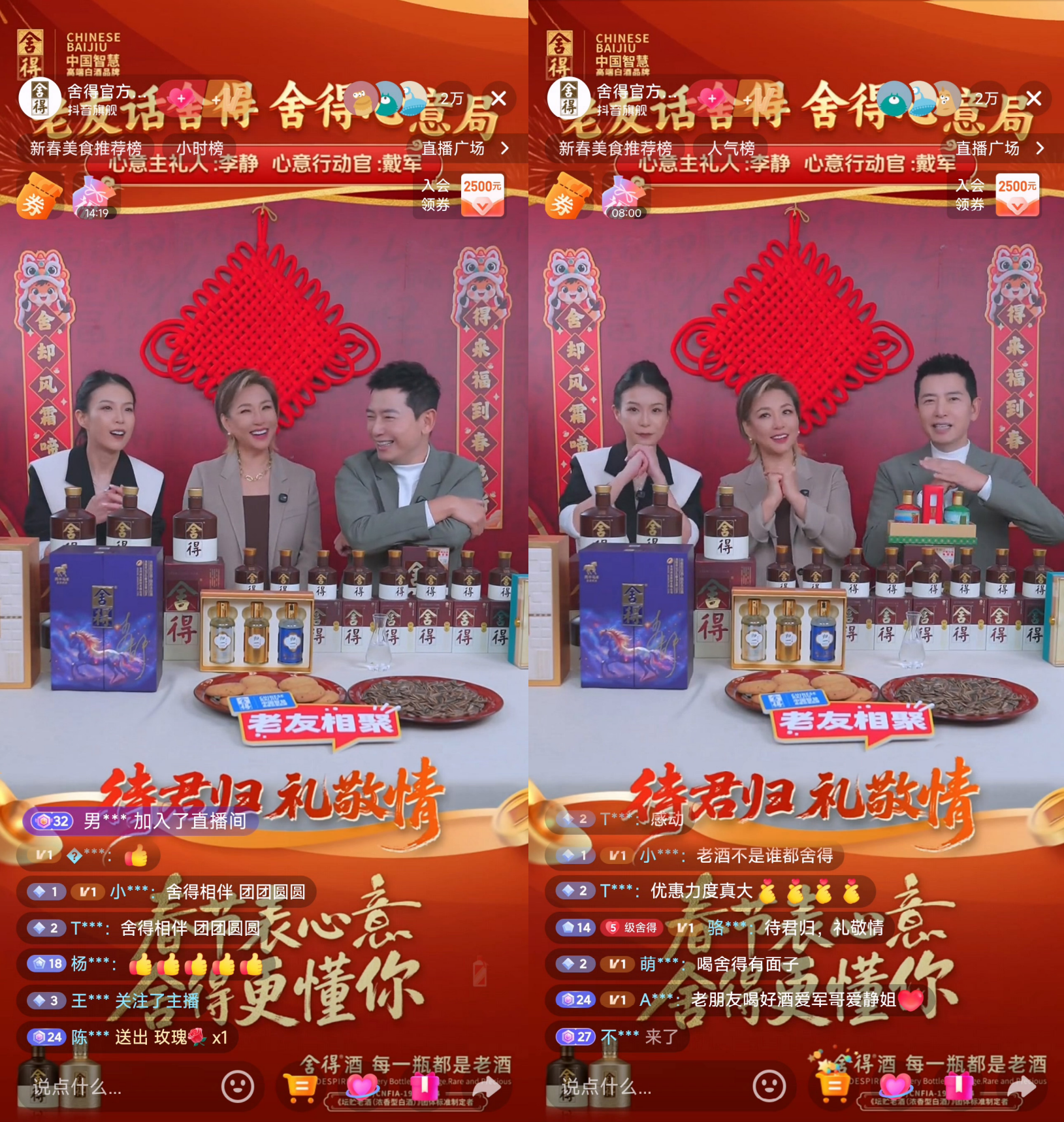 承接線上傳播熱度,2月1日晚,捨得酒特邀“心意代言團”李靜、戴軍做客舍得官方旗艦店抖音直播間。區別於傳統直播帶貨,捨得酒用“老友+老酒”延續心意主題,打造出一場“強互動、深共鳴、高轉化”的深度溝通場。