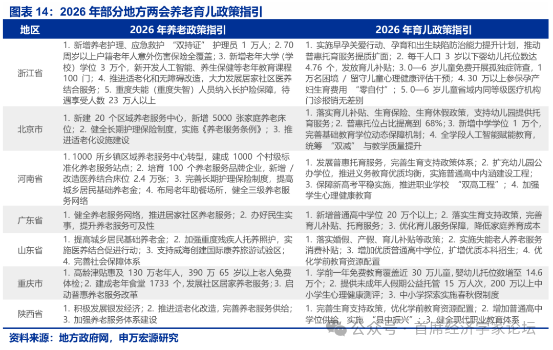 3.擴內需仍是首要任務,“以舊換新”常態化。服務消費地位提升,各地聚焦“首發經濟”、“銀髮經濟”創造新需求。新質生產力方面,各地依據稟賦差異化佈局:北京聚焦AI+與量子科技,浙江爭創集成電路集羣,西部依託資源佈局綠色算力。民生工作聚焦“一老一小”與重點羣體就業,多地將長護險、育兒補貼納入民生實事,浙江推行“培訓+就業”一體化模式。