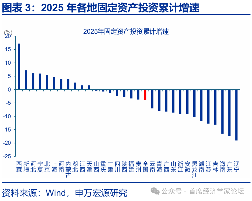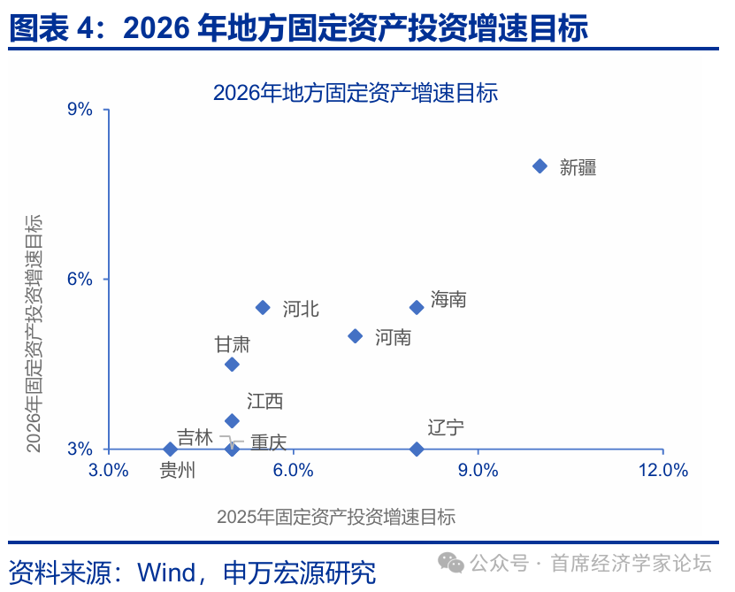 各地投資增速目標分化加劇,西部地區投資目標更具“衝勁”。從 2026 年各省市公佈的固定資產投資目標來看,新疆設定了 8%左右的較高投資增速目標。陝西特別強調“工業投資年均增長 6%左右”,或表明製造業升級是其投資的核心抓手。相比之下,沿海發達省份及直轄市目標普遍設定在 5%左右,例如,廣東設定爲 5%,河北投資增速目標設定爲 5.5%,吉林目標設定爲 3%。此外,北京未設定具體增速數值,而是提出“持續優化投資結構”。