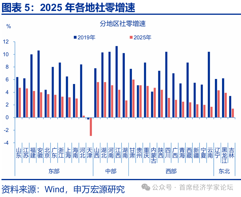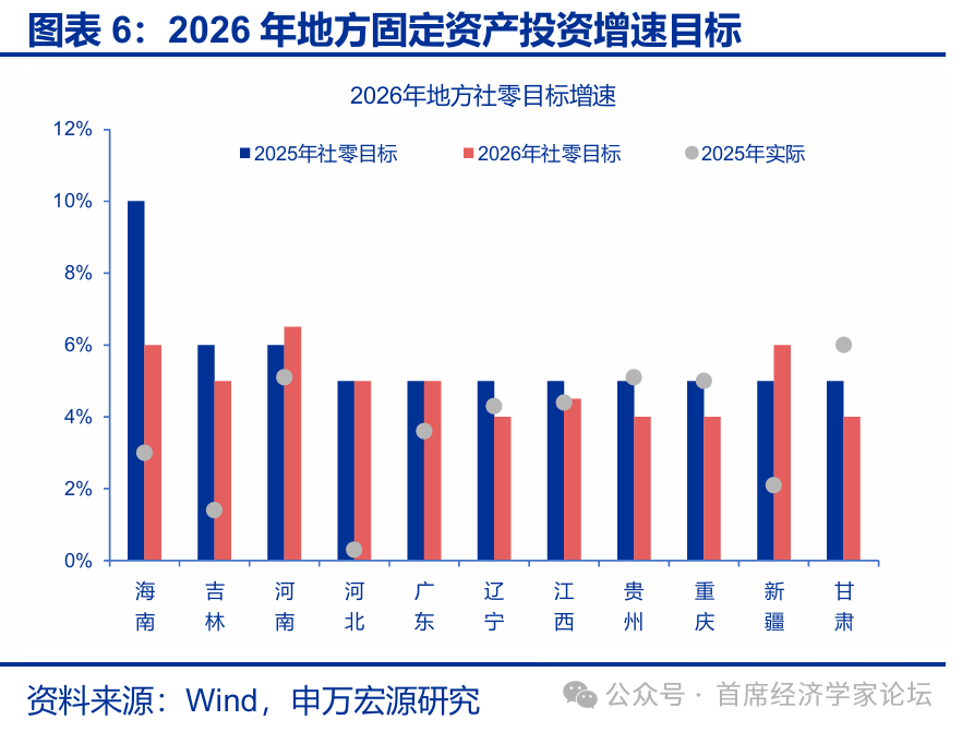 社零目標方面,多數地區的目標預期增速高於2025年實際表現。新疆、河南、海南、陝西等地均將社零增速目標定在6%及以上;河北、吉林定在5%左右。貴州、甘肅、遼寧及重慶的目標相對保守,均設定爲4%及以上。與2025年地方社零增速目標相比,河南、新疆目標分別上調0.5個百分點和1個百分點;河北和廣東目標維持在5%左右。而與2025年地方實際社零增速相比,河北、吉林、河南、廣東、海南、新疆明顯調高社零增速目標。