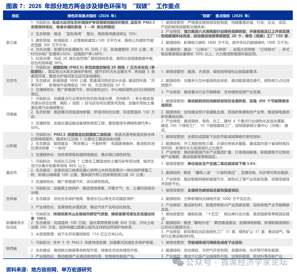 2.投資方面,區域分化加劇,西部更具“衝勁”。新疆投資目標達8%,沿海省份多定於5%左右;陝西強調製造業升級。消費方面,多數地區社零目標高於2025 年實際增速,河南、新疆上調明顯,河北、廣東維持 5%左右。民生與環保指標趨硬,就業優先導向明顯,粵魯豫均設定百萬級新增就業目標;綠色約束強化,吉林提出全面轉爲碳排放雙控,京魯明確PM2.5控制數值。