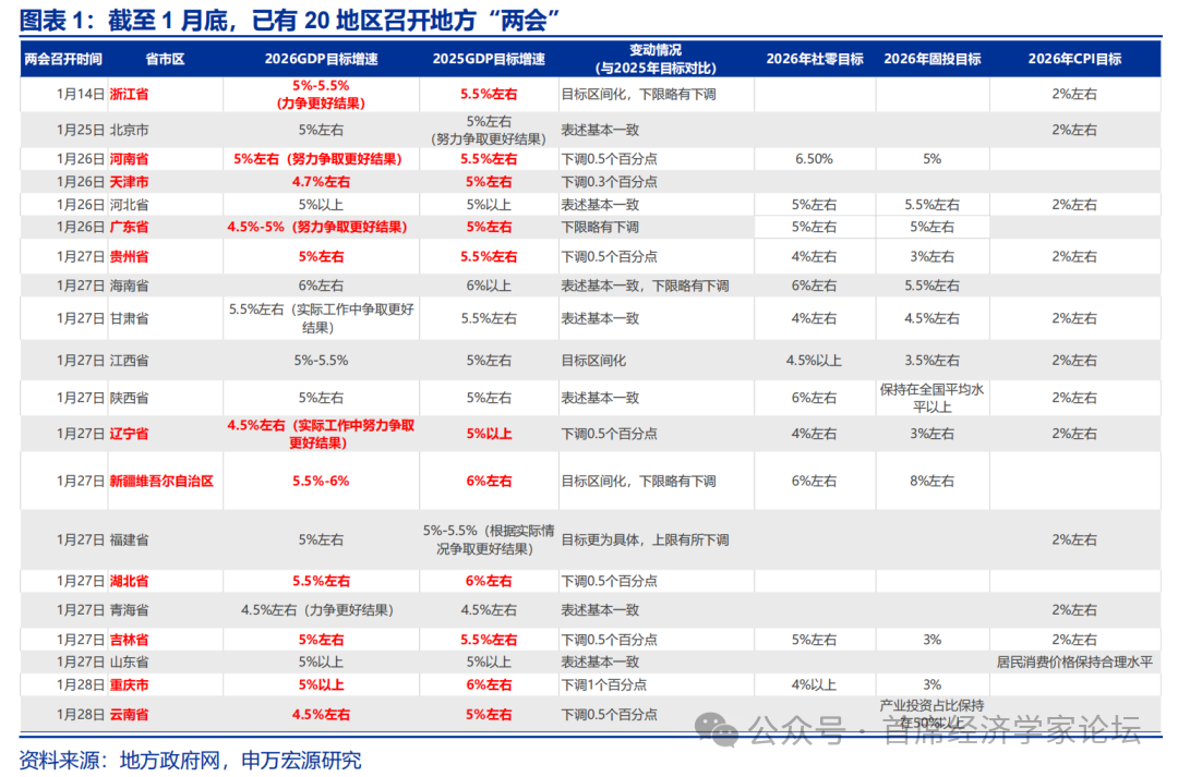 1.截至1月底,20省市披露2026年GDP目標,加權平均值爲5.1%,雖較2025年目標微降0.2個百分點,但較2025年實際增速提升0.1個百分點,設定更爲務實積極。北京、山東等8地將目標定爲5%左右及以上;海南(6%左右)、新疆(5.5%-6%)增速領跑。廣東、河南、浙江等經濟大省表述積極,強調“實際工作中爭取更好結果”。