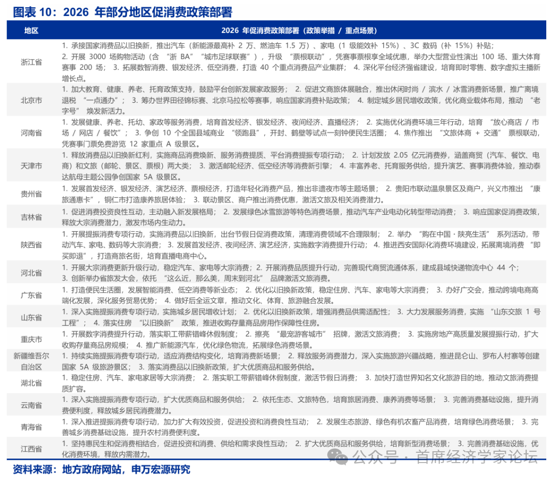 擴內需仍是地方首要任務,從傳統的實物消費刺激轉向“實物與服務並重”。 “以舊換新”成爲2026年乃至未來的常態化政策,山東、廣東、河南等地均明確提出深入實施消費品以舊換新行動,並強調增強消費品供需適配性。服務消費被提到了前所未有的高度,北京提出大力發展家政服務、養老托育;浙江強調拓展文旅、康養、體育等服務消費;重慶提出打造“不夜重慶”和“新韻重慶”文旅品牌。此外,“首發經濟”、“銀髮經濟”成爲擴內需高頻詞。河南提出發展首發經濟、夜間經濟;浙江設立全國首個省級銀髮經濟產業園,或指向各地更加註重供給改革創造新的消費需求。