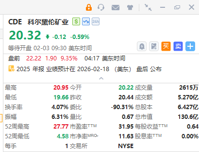 華盛資訊2月3日訊,貴金屬股盤前反彈,科爾黛倫礦業 、泛美白銀均大漲超9%,金羅斯黃金漲超6%;消息面上,現貨黃金、白銀價格均強勢回升;