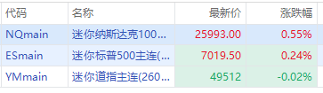 美股三大期指盤前漲跌不一,納指期貨 $NQmain 漲0.55%,標普500期貨 $ESmain 漲0.24%,道指期貨 $YMmain 跌0.02%。