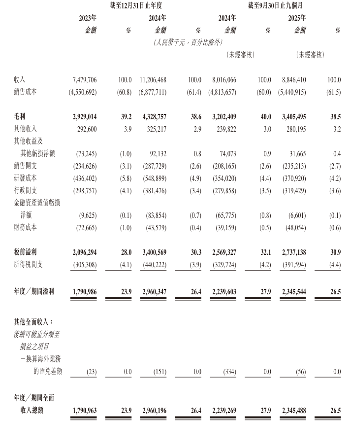 公司2023年、2024年分別錄得溢利17.91億元、29.6億元。2025年首9月,溢利同比增長4.73%至23.46億元。