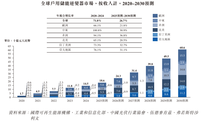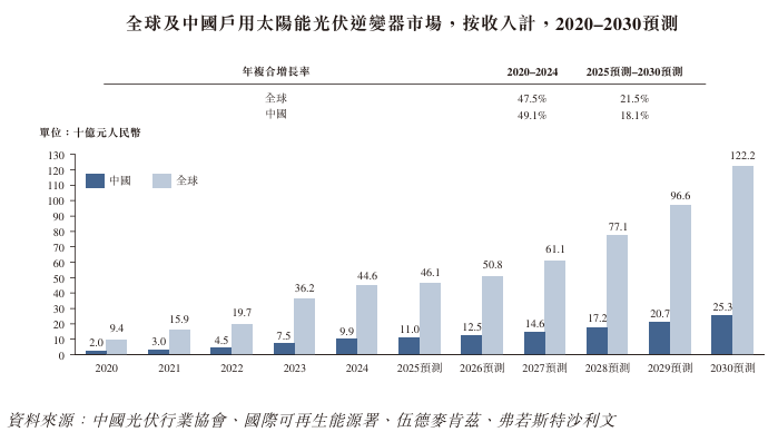 全球戶用太陽能光伏逆變器市場從2020年的94億元增長至2024年的446億元,複合年增長率達47.5%。同期中國市場從20億元增至99億元,複合年增長率達49.1%。預計到2030年,全球及中國市場將分別達到1,222億元和253億元,2025至2030年期間年複合增長率分別爲21.5%和18.1%。