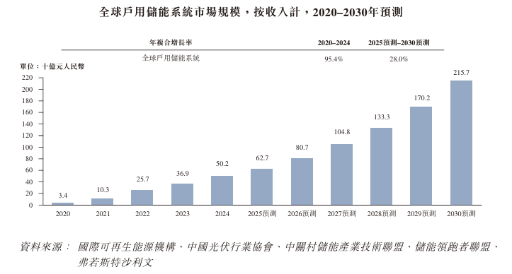 受全球戶用儲能系統加速部署、戶用電價上漲及能源自用與備用電源需求增長的驅動,全球戶用儲能系統市場已實現快速增長。市場規模由2020年的34億元增至2024年的502億元,複合年增長率達95.4%。預計市場規模將持續擴大,從2025年的627億元增長至2030年的2,157億元,對應複合年增長率爲28.0%。