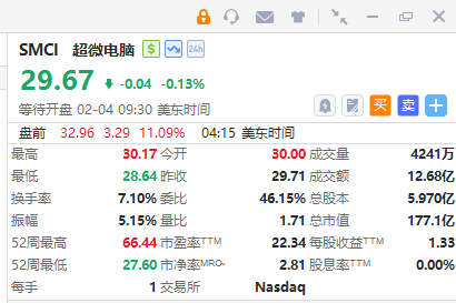 華盛資訊2月4日訊,美股盤前,超微電腦大漲超11%,新財季業績指引超預期;