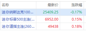 美股三大期指盤前漲跌不一,納指期貨 $NQmain 跌0.17%,標普500期貨 $ESmain 漲0.15%,道指期貨 $YMmain 漲0.18%