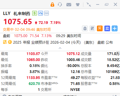 禮來盤初大漲,總市值重回1萬億美元上方。消息面上,禮來公佈強勁的2025年第四季度財報,營收同比增長43%至193億美元,調整後每股收益同比增長42%至7.54美元,分別超出分析師預期的180億美元和6.73美元。期內,Mounjaro和Zepbound兩款產品合計銷售額超過116億美元,佔公司總營收的60%以上。另外,禮來給出積極的業績指引,預計2026年全年營收將在800億至830億美元之間,調整後每股收益將在33.5至35美元之間,分別超出分析師預期的777億美元和33.08美元。