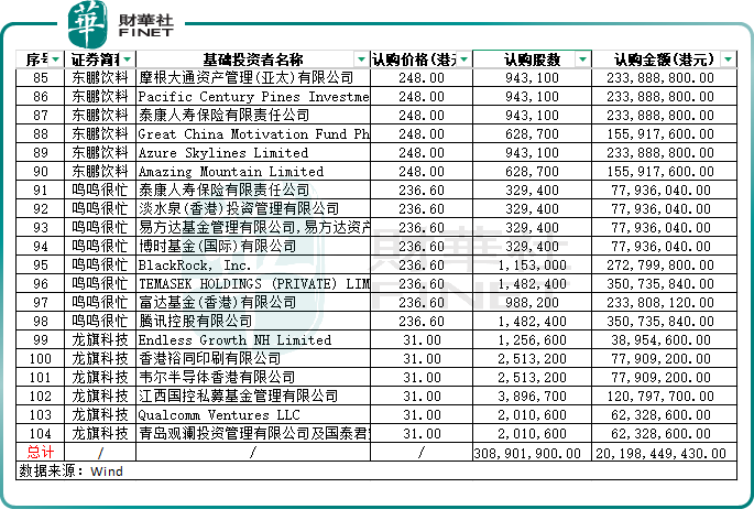 在獲得基石投資的企業中,東鵬飲料(605499.SH)(09980.HK)、大族數控(301200.SZ)(03200.HK)和鳴鳴很忙(01768.HK)等公司獲得境內外資本熱烈追捧。其中,東鵬飲料更獲得淡馬錫、卡塔爾投資局、瑞銀和騰訊等知名機構共同加持。