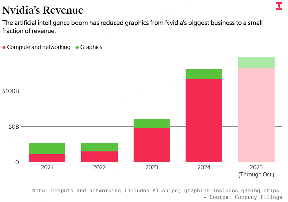 隨着AI芯片業務快速增長,遊戲顯卡在英偉達營收中的比重已大幅下降。在截至10月的前九個月中,遊戲GPU收入僅佔總營收約8%,而2022年同期這一比例仍高達35%。