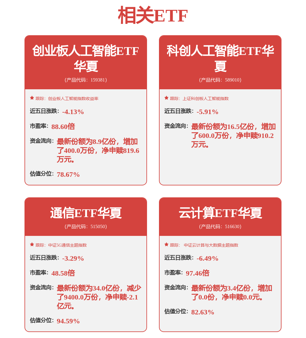 通信ETF華夏(515050)深度聚焦電子(芯片、PCB、消費電子)+通信(光模塊、服務器)算力硬件。前五大持倉股:中際旭創、新易盛、立訊精密、工業富聯、兆易創新。場外聯接(A類:008086;C類:008087);