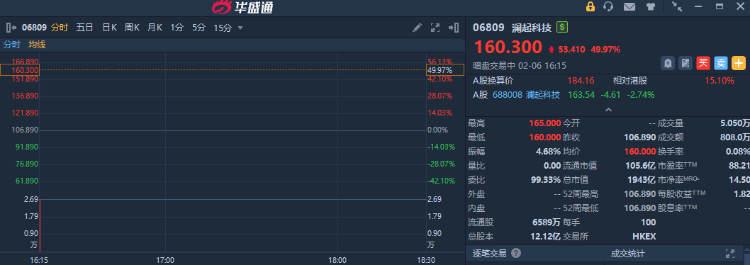 華盛資訊2月6日訊,港股瀾起科技正在暗盤交易中,截至發稿漲49.97%,報160.30港元/股,中籤一手賬面浮盈約5341港元,最新總市值爲1943億港元。