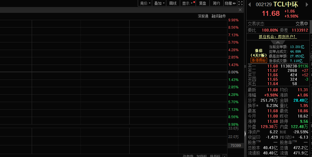 2月9日,光伏概念板塊集體走強,個股方面,TCL中環(002129)股價漲停。