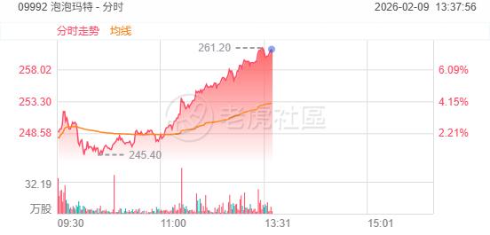 2月9日,港股新消費概念股走高,泡泡瑪特漲超7%,老鋪黃金、布魯可漲超5%,小鵬汽車-W、鳴鳴很忙、名創優品漲近3%。