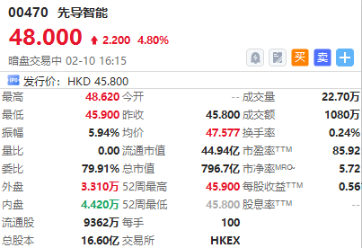 華盛資訊2月10日訊,港股先導智能正在暗盤交易中。截至發稿,漲近5%,中籤一手賬面浮盈220港元,最新總市值超796億港元。