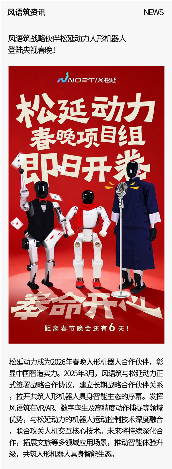 近日,中央廣播電視總檯與松延動力聯合官宣,松延動力正式成爲《2026年春節聯歡晚會》人形機器人合作伙伴,標誌着前沿科技與國民文化盛事實現首次深度跨界融合,也彰顯了中國智造向“以人爲本”階段邁進的溫暖初心。