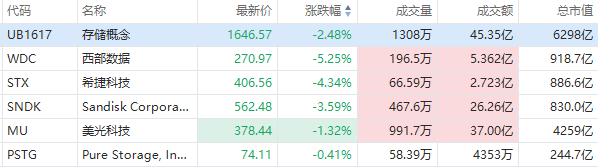 存儲概念股續跌,西部數據跌超5%,希捷科技跌超4%,閃迪 $SNDK 跌超3%,美光科技跌超1%。