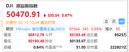 華盛資訊2月10日訊,美股道瓊斯指數盤初拉昇續創歷史新高,漲約0.7%。成分股中美國運通、迪士尼、賽富時漲超2%,高盛,家得寶漲超1%。