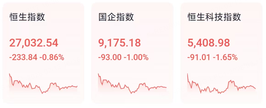 2月12日週四,港股三大指數全天表現低迷,連續三個交易日上漲的勢頭戛然而止。恒生科技指數一度跌至2%,最終收跌1.65%,恒生指數跌0.86%險守27000點,國企指數跌1%。