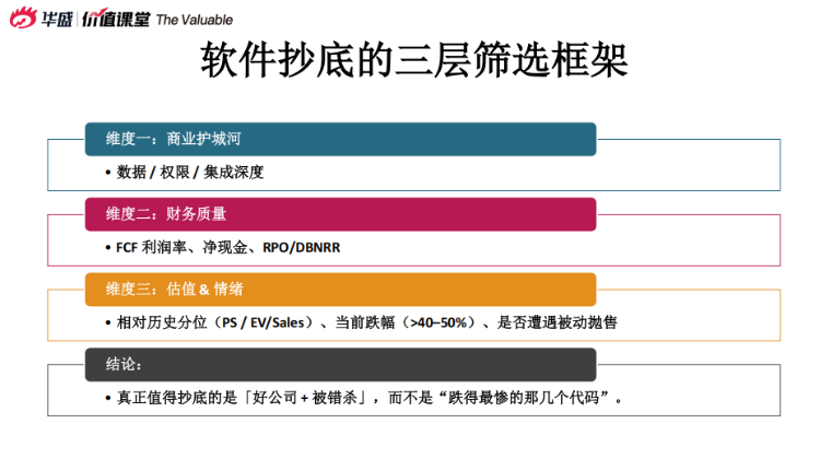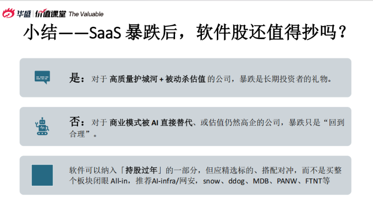 其結論是精選高質量、被錯殺的SaaS公司,避免盲目抄底整個板塊;推薦方向:AI基礎設施、網絡安全(PANW、FTNT)、數據庫(SNOW、MDB)、可觀測性(DDOG)。