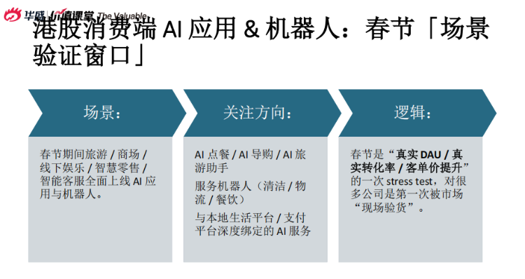 2、消費端AI/機器人:春節是真實場景驗證窗口(AI導購、服務機器人等),假期後根據實際數據篩選標的。