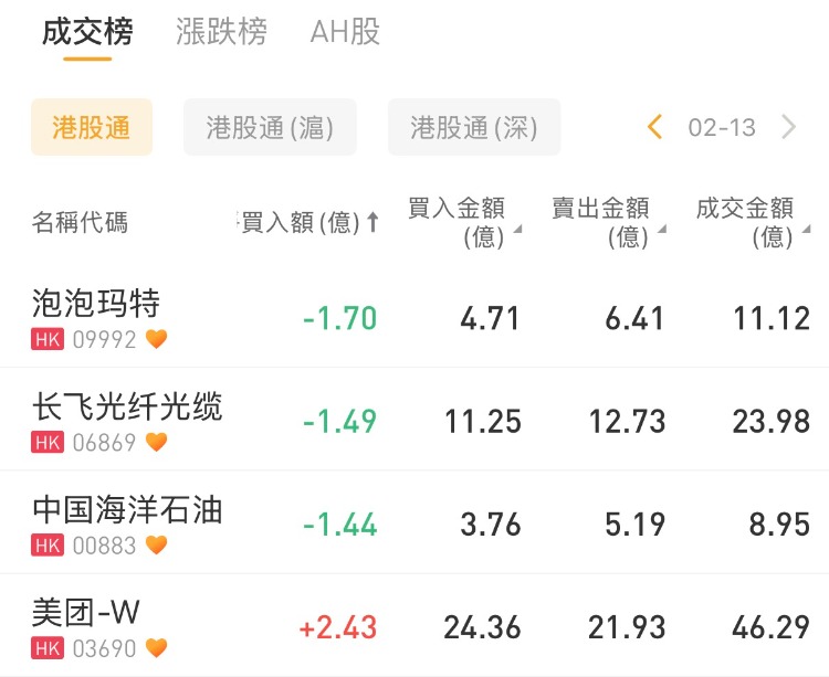 泡泡瑪特、長飛光纖光纜、中國石油分別遭淨賣出1.7億港元、1.49億港元、1.44億港元。