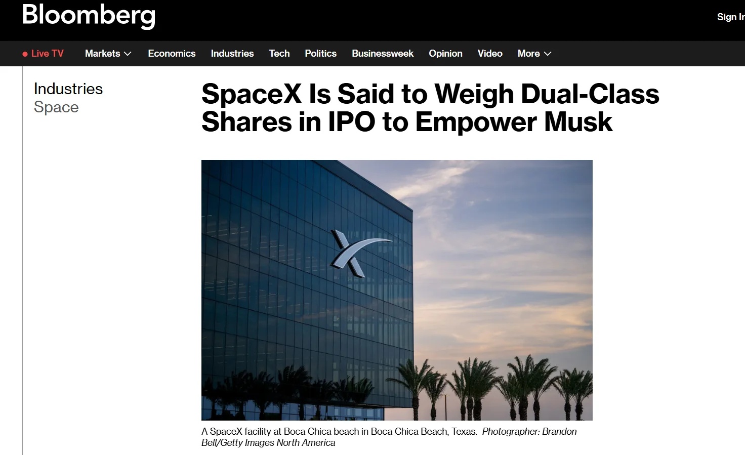 據報道,SpaceX考慮在今年計劃的 IPO 中採用雙層股權結構,效仿創始人馬斯克在特斯拉提出的方案。